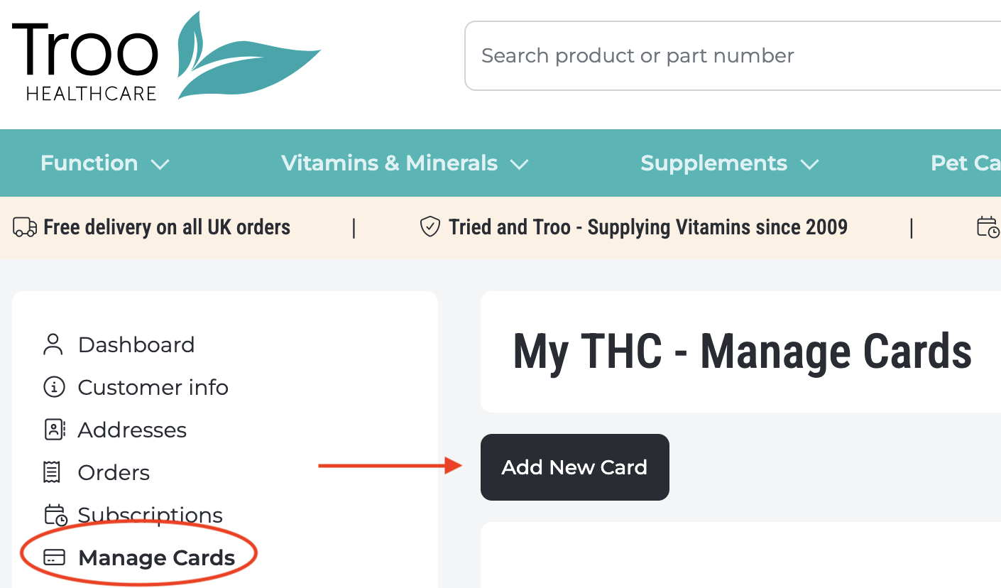 Now Click on th blake 'Account Menu' bar and select 'Manage Cards' from the list. This will open the manage cards screen and from there you can add and/or delete your payment cards.