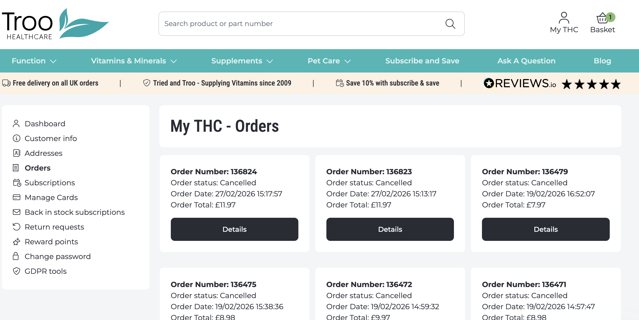 - Your online account - you can login and access your order history from your account page. Click on the 'Details' button for any order you wish to check.